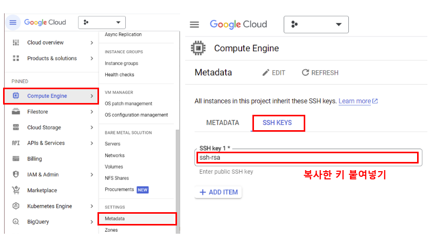 d) GCP Compute Engine > Metadata > SSH KEYS 탭에 위에서 확인한 공개 키 붙여넣기