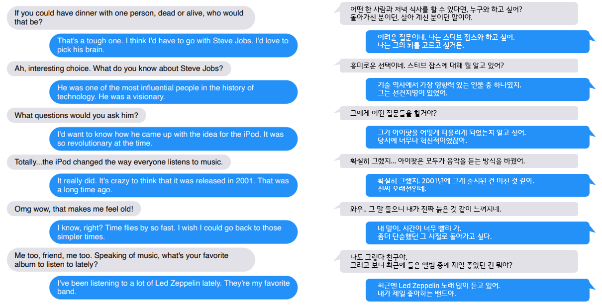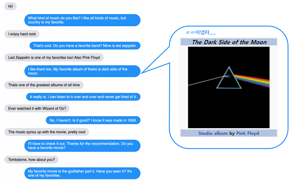 잘 된 예시로 고른 것이지만, 유식하고 (외부 지식 활용 good) 자연스럽게 대화를 잘 이어나가는 게 신기함.