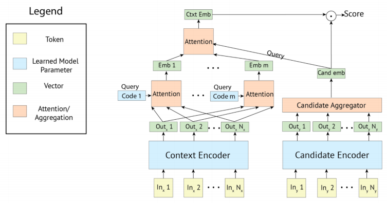 Poly-encoder은 여러 representation(N개의 코드들)을 사용해서 문맥의 전체적인 특성을 인코딩하고, 이 인코딩 된 특성들은 각각의 가능한 후보 답변들에게 attend 된다. 이 attention 메커니즘을 사용할 때 하나의 글로벌 벡터 representation을 사용하는 것보다 성능이 좋았고, 계산적으로 여전히 가능한 수준이었다. 참고로 poly-encoder은 다양한 대화 모델에서 SOTA 성능을 보이는 알고리즘이다.)