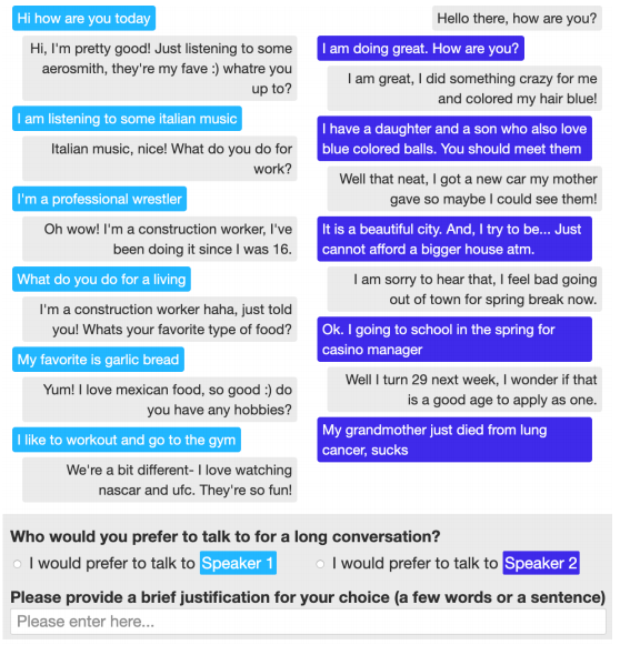 > 사람 평가자는 두 개의 긴 대화를 보고, 다음의 두 가지 질문에 답해야 함 :