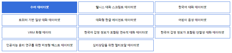 | 웰니스 대화 스크립트 | 세브란스 상담 데이터를 기반으로 구축한 정신 상담 데이터셋 - 359개 대화의도에 대한 5,232개 사용자 발화 - 1,023개 챗봇 발화 포함 |