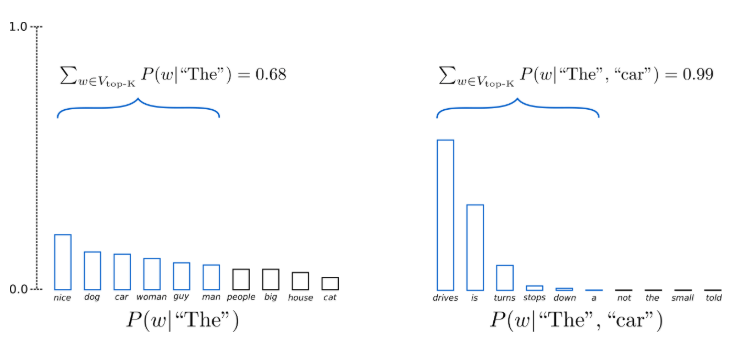 - 확률이 비교적 평평했던 첫 번째 타임스텝에서는 가능성 있는 (nice, dog, ..., big, house)까지 총 9개의 토큰을 샘플링 풀에 넣어야 누적확률 0.94를 채울 수 있었다. 하지만 분포가 가팔랐던 두 번째 타임스텝에서는 확률이 굉장히 높은 (drives, is, turns)에서만 샘플링하게 되고, 이상한 토큰을 샘플링할 확률이 훨씬 적어진다.