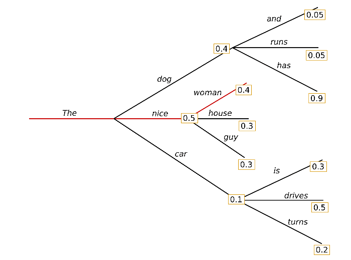 예를 들어 모델이 위와 같이 단어를 디코딩할 수 있었다고 하면, Greedy 전략에서는 매 시점 가장 높은 확률 값을 가지는 nice(p=0.5) -> woman(p=0.4)을 선택하게 되고, 이 문장의 최종 확률은 0.5*0.4 = 0.2가 된다. 하지만, nice(p=0.5) 토큰에 가려져 선택하지 못했던 dog(p=0.4)에 잇따르는 토큰은 has(p=0.9)로, 이 트랙을 따랐다면 더 좋은 토큰을 선택할 수 있었을 것이다.